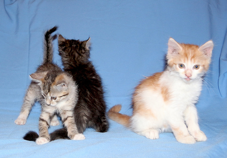 Рыжий Персик, темный пушистый - Пупсик и чрезвычайно нежная куколка-девочка Масяня. Все очень активные, игривые, ласковые. Очень любят руки и тянутся к общению.